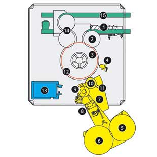 • From the powered unrolling station for the label rolls 5 (spare roll 6) via many spring-loaded tension rollers, the label is guided to electronic scanning. The spring-loaded tension rollers ensure continuous feed.